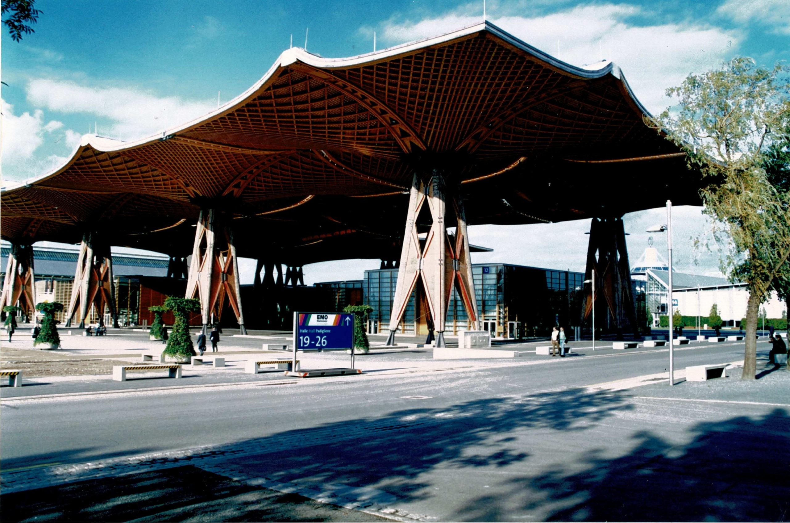 Tor zur Innovation: Seit der EXPO 2000 betreten Fachbesucher das Messegelände Hannover am Eingang Nord 1 durch das prägnante Holzdach. Die weitgespannte Konstruktion aus Leimholz steht sinnbildlich für das, was auf der EMO präsentiert wird: technische Präzision, innovative Gestaltung und nachhaltige Ansätze in der Produktionstechnik Foto: Presseagentur Fecht