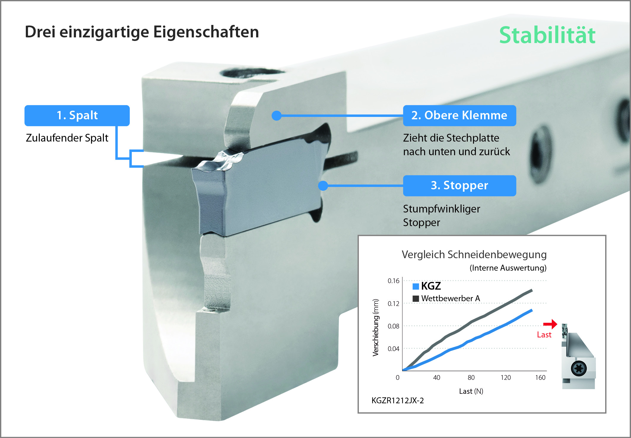 Im Allgemeinen ist es strukturell schwierig, die Schneidplatte direkt oberhalb bei einem Abstechwerkzeug zu montieren.. Die Abstechlösung „KGZ“ verfügt jedoch über einen abgeschrägten Schlitz mit einer schrägen Rille, die beim Anziehen der Befestigungsschraube direkt über der Wendeschneidplatte eine effektive Haltekraft ausübt.