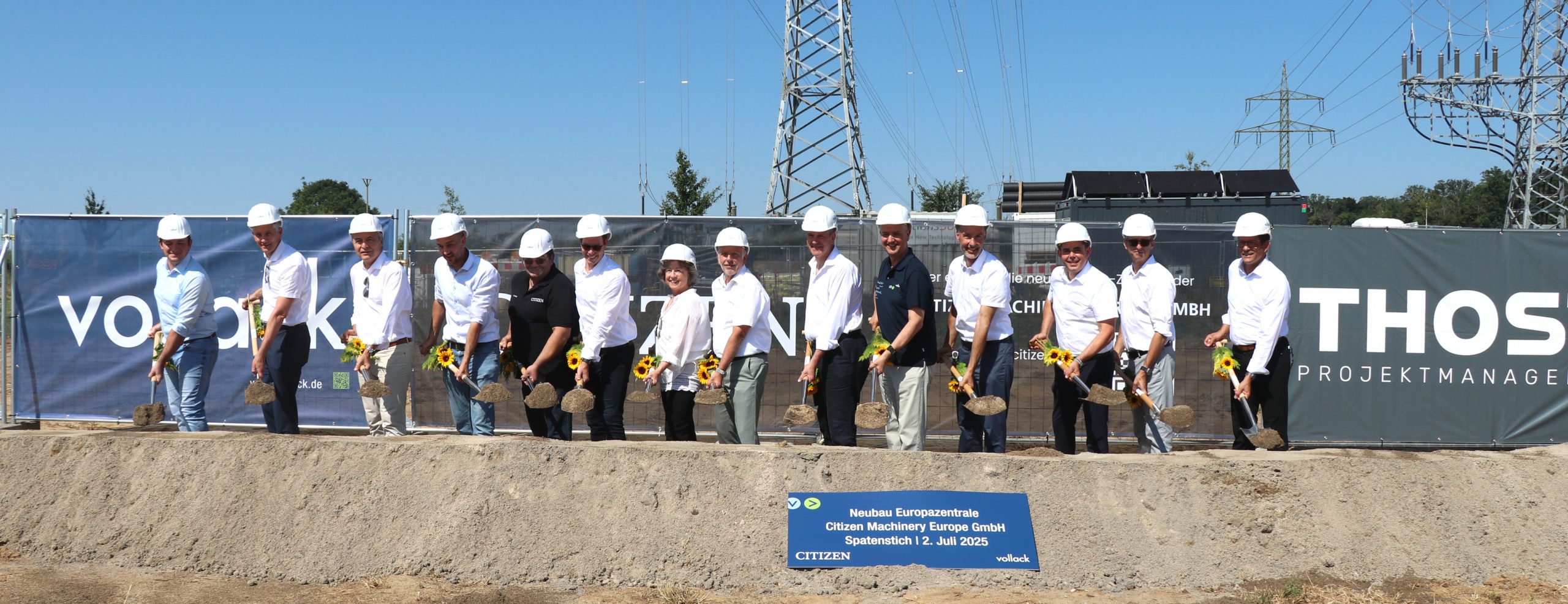 Markus Reißig: „Mit dem symbolischen Spatenstich für die neue Europazentrale setzt Citizen Machinery Europe nicht nur ein starkes Zeichen für Wachstum und Kundennähe – auch architektonisch setzt Vollack ein besonderes Statement.“ Die Gestaltung des Neubaus nimmt danach direkten Bezug auf die traditionsreichen Wurzeln des Mutterkonzerns in der Uhren- und Feinmechanik. So zitiert das Architekturkonzept Elemente eines Uhrwerks – etwa das Zifferblatt, die Zeiger oder Stundenindizes – und übersetzt sie in markante bauliche Details. Schrägstehende Stützen am Bürogebäude, gezielt positionierte Fensterpfosten und charakteristische Strukturen der Pfosten-Riegel-Fassade greifen diese Gestaltungsidee auf und machen sie konstruktiv sichtbar. Ein zentrales Thema ist die nachhaltige Energieversorgung über ein Nahwärmenetz, welches in Kombination mit Solewärmepumpen und Luftwasserwärmepumpen den Heiz- und Kältebedarf der Gebäude decken wird. Abgerundet wird das Konzept durch Photovoltaik-Flächen auf Dächern und an den Fassaden. Weitere Fassadenflächen werden zudem teilweise begrünt.