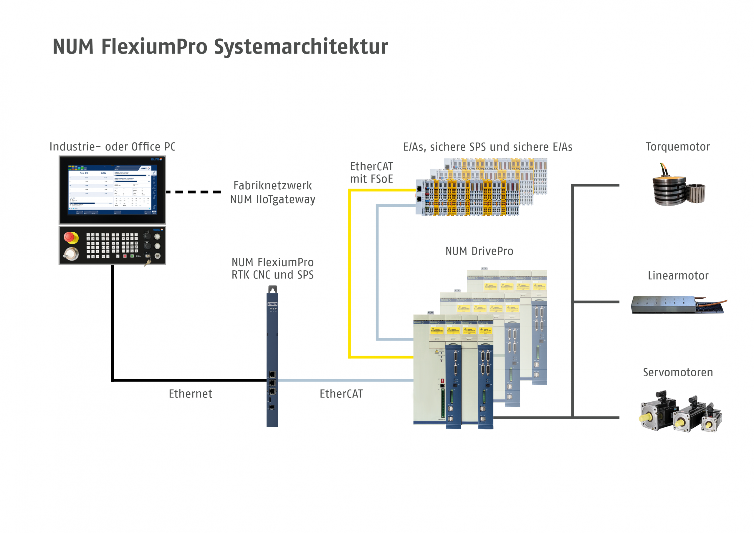 Im Fokus der Weiterentwicklung standen jene Aspekte der CNC-Fertigung, welche auch für deren Anwender die größte Bedeutung haben: Leistungsfähigkeit, Geschwindigkeit, Präzision und Zuverlässigkeit. In diesem Sinne wurde für die neue Version der CNC-Plattform die Hardware-Konfiguration, bestehend aus einem Real Time Kernel (RTK) mit CNC und SPS, den Antriebsverstärkern (NUM DrivePro), den Servomotoren und dem erforderlichen PC umfassend überarbeitet. Ein deutliches Plus an Zuverlässigkeit und Systemverfügbarkeit erzielt FlexiumPro nicht zuletzt durch die Integration von SPS- und CNC-Prozessen auf nur einer einzelnen Platine, basierend auf einem Multi-Core-ARM-Prozessor. Durch den Einsatz der System-on-Chip-Technologie gelingt NUM mit FlexiumPro eine Steigerung der CNC-Rechenleistung um das Zehnfache gegenüber der letzten Version von Flexium+, bei strenger Synchronisation von CNC und SPS.